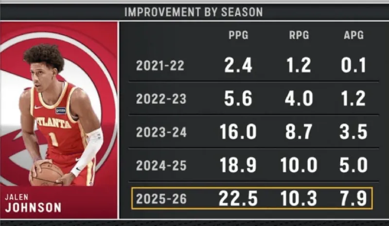 美媒ClutchPoints更新社媒:“杰伦-约翰逊本赛季的数据。”